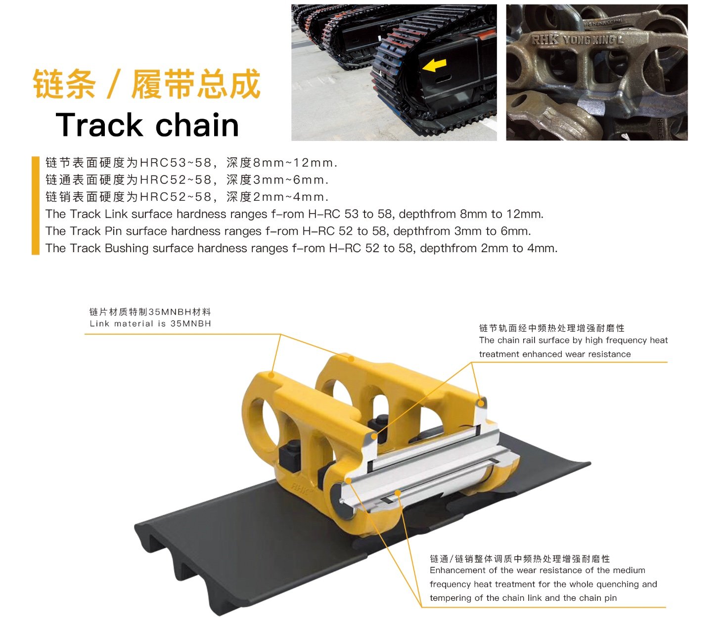 The RHK track chain products by YONGXING MACHINERY are precision-engineered in a state-of-the-art machining center. Utilizing specialized heat treatment technology, we achieve a material hardness range of HB 364-444, which significantly reduces the likelihood of deformation.